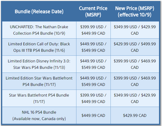 The Playstation 4 will get a $50 price drop across the board, effective tomorrow. The price drop will also apply to all the recently announced bundles, which they've detailed in this handy chart: